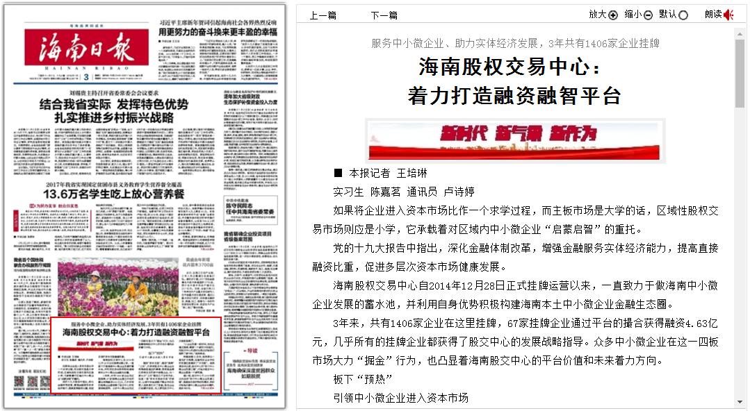 近日,證券導(dǎo)報(bào)以四個(gè)版面整版報(bào)道海南股權(quán)交易中心,關(guān)注股交中心三年以來的發(fā)展。其中,通過一個(gè)版面的篇幅,提煉總結(jié)了股交中心“助力中小微企業(yè)發(fā)展工程”啟動(dòng)一年以來,在服務(wù)企業(yè)、推動(dòng)企業(yè)發(fā)展等方面走過的歷...