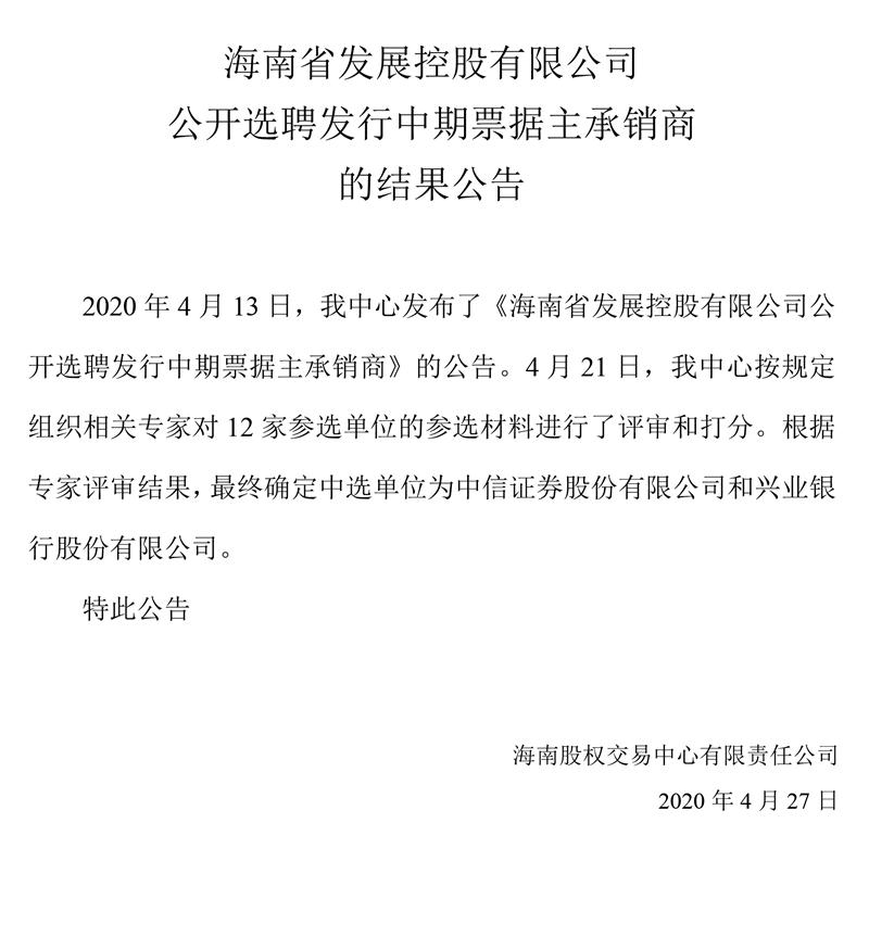 海南省發(fā)展控股有限公司公開選聘發(fā)行中期票據主承銷商的結果公告