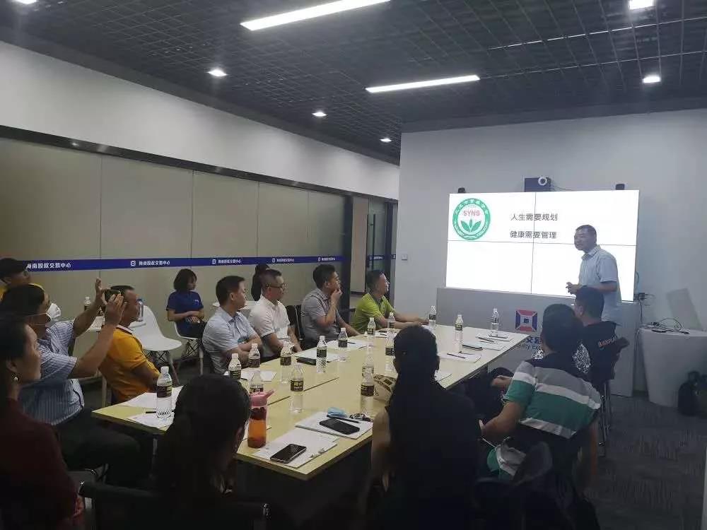 5月8日、9日下午海南股交三亞分中心攜手合作單位盟商匯邀請三亞健康營養(yǎng)學(xué)會會長吳仕銘帶來以健康為主題的講座,約80家當(dāng)?shù)刂行∥⑵髽I(yè)派代表參加了講座。